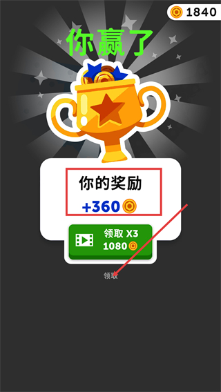 4、通关后点击【领取】获得【+360金币】奖励,也可观看视频领取3倍奖励。