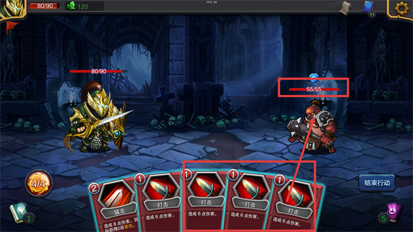 2、战斗时优先使用【打击】卡牌攻击【55/55】血量的敌人,搭配【猛击】可叠加易伤效果提升输出。