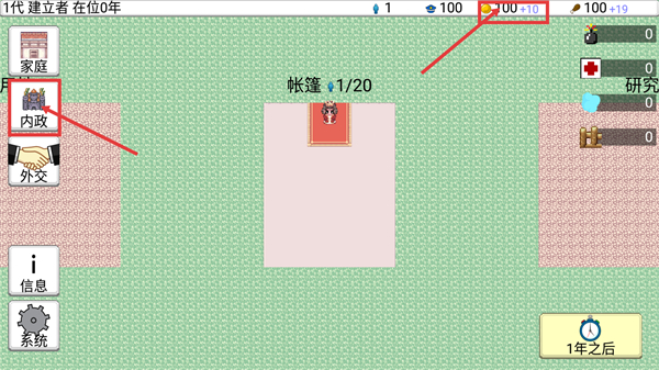 1、开局先点击【内政】选项,关注资源变化(如【100+-10】),同时留意【帐篷-1/20】的建设进度,稳步推进发展。