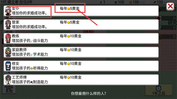 2、雇佣人员时注意成本,比如【女仆-每年-5黄金】,按需选择能提升对应能力的角色,避免资源浪费。