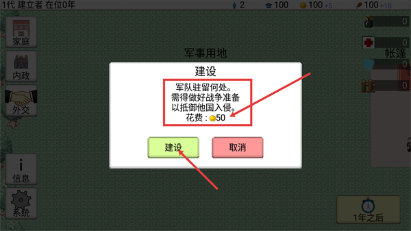 3、解锁【军事用地】后,优先建设【建设处】,花费【50】资源打造军队驻留地,为后续防御做准备。