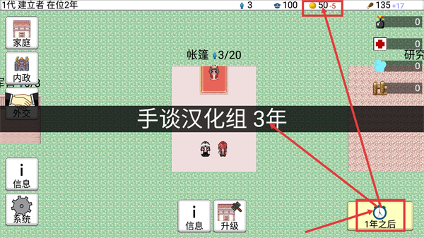 4、点击【1年之后】推进时间,观察资源(如【50-5】)与【帐篷-3/20】的变化,同步解锁新功能(如【升级】)来增强发展效率。