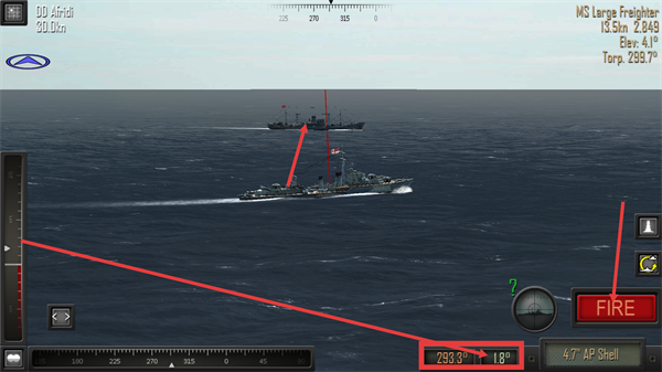 3、锁定【MSLargeFreighter】目标后,调整角度至【293.3°】,搭配【4.7"-AP-Shell】点击【FIRE】发起攻击。