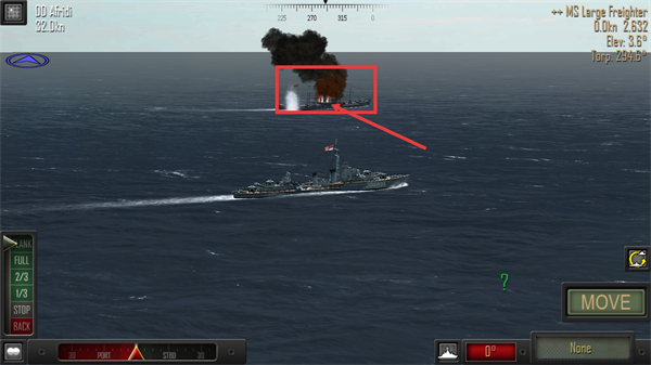 2、操控【DDAfridi】舰船时,通过【PORT-STBD】角度刻度调整航向,选择【FULL】航速后点击【MOVE】推进舰船。