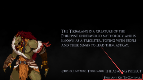 2、了解角色背景:在故事模式中,你会看到角色介绍,例如“TIKBALANG”的描述,了解角色背景故事后,点击“PRESS ANY KEY TO CONTINUE”继续。