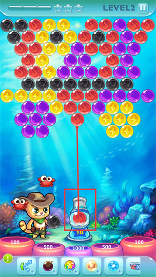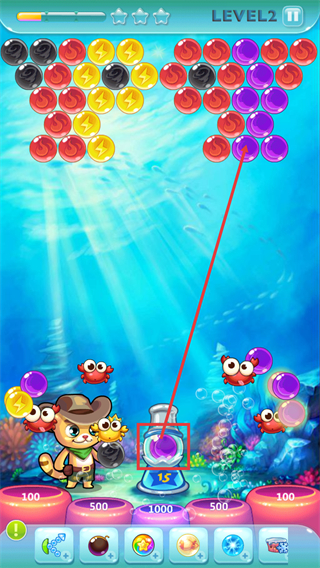 2、在【LEVEL2】关卡中,发射【18】号红色泡泡时,瞄准同色泡泡聚集区,可触发连锁消除提升分数。