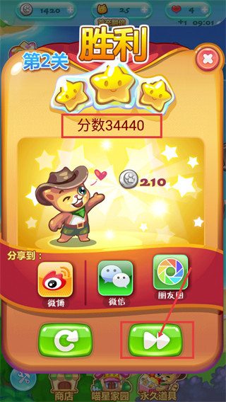 4、通关【第2关】后,点击绿色箭头按钮可进入下一关,同时可通过【210】银币等奖励解锁道具。