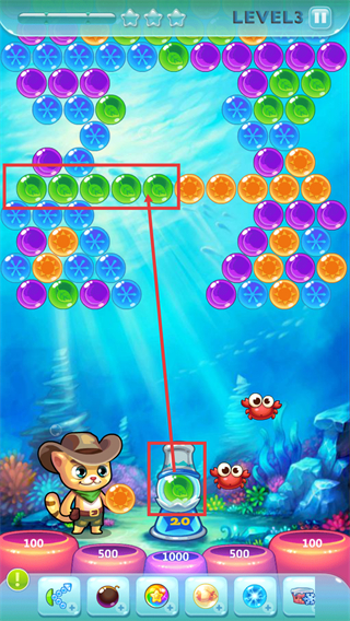 2、在【LEVEL3】关卡中,发射【20】号绿叶泡泡时,瞄准左侧绿叶泡泡群,触发消除以清理区域推进关卡。