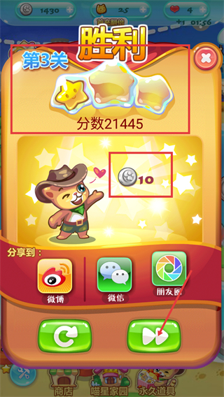 4、通关【第3关】后,可获得【10】银币等奖励,点击绿色箭头按钮可进入下一关,积累资源解锁更多道具。