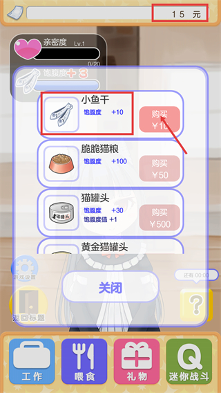 3、在喂食界面选择【小鱼干】,花费10元点击【购买】,提升角色的【饱腹度】数值。