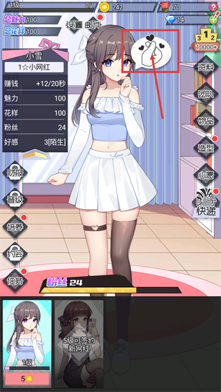 1、点击角色旁的互动标识,触发与【小雪】的互动事件,推进角色好感度等属性的提升。