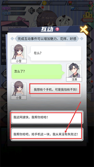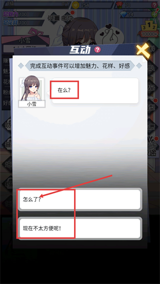 3、针对【小雪】的诉求,选择对应的回复选项,完成互动对话以提升角色相关属性。