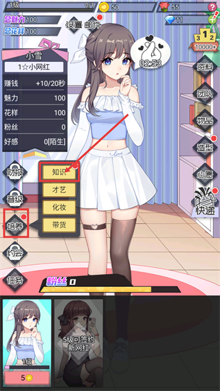 1、点击【培养】按钮选择【知识】选项,进入知识学习界面,开启网红属性提升的学习模块。