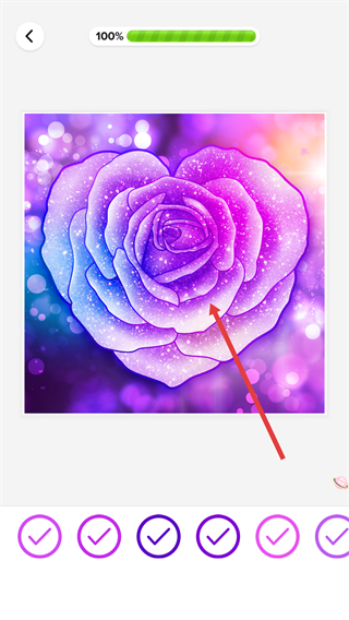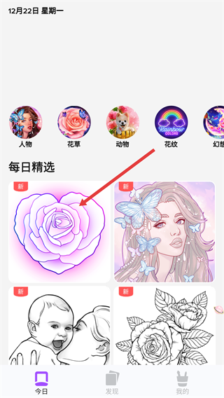 1、在【每日精选】中选填色素材,比如心形玫瑰图案,点击即可进入对应的填色关卡。