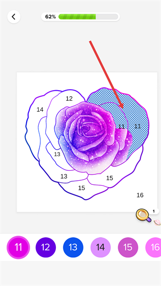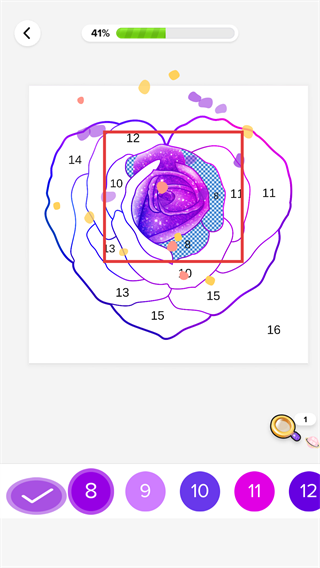 3、切换数字持续填色,进度条会随填色区域增加而上涨,逐步完成图案的色彩填充。