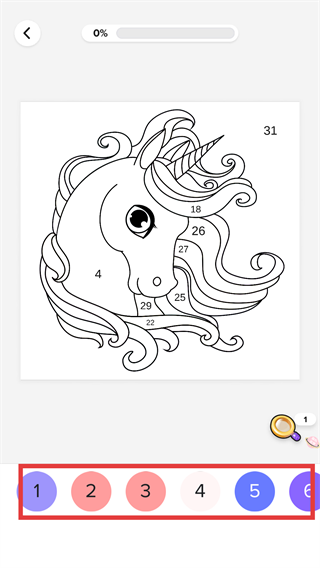1、选择独角兽填色素材,界面底部有数字按钮,点击对应数字可填充图案中同数字区域。