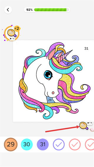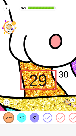 2、填色进度达92%时,选中【29】数字,对应区域会填充专属色彩,还能获取道具奖励。