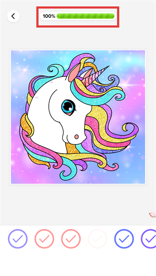 4、填色进度满100%后,图案呈现完整炫彩效果,成功完成本次独角兽素材的填色任务。