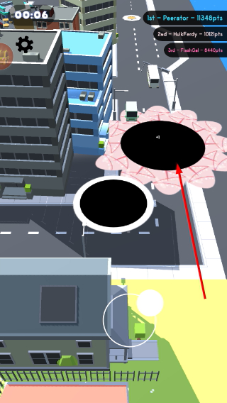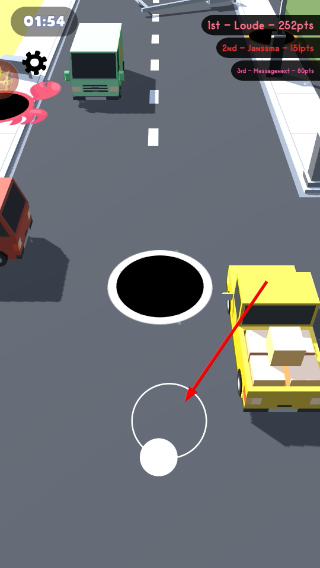 1、通过底部操控键移动黑洞,靠近场景中的车辆等物体,准备吞噬以扩大黑洞规模。