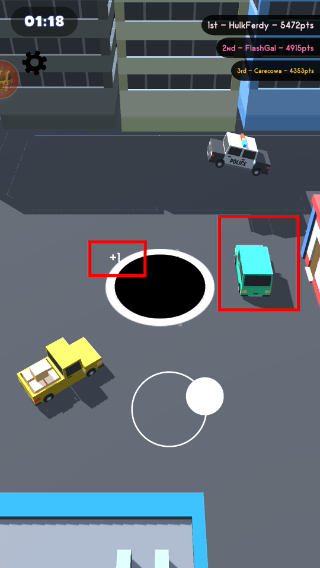 2、吞噬车辆后界面显【+1】,黑洞体积会随之增大,同时积分也会对应提升。