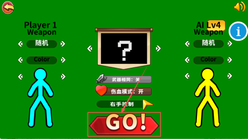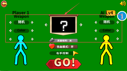 2、设置玩家:在设置界面,为玩家1和AI选择武器和颜色,并调整游戏难度和控制方式。