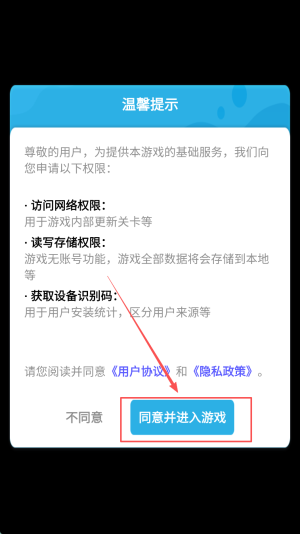 1、进入游戏:首先打开游戏主界面,阅读温馨提示后点击“同意并进入游戏”按钮,完成授权进入主菜单。