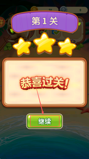 4、通关晋级:当画面弹出“第1关 恭喜过关!”,点击“继续”按钮,进入下一关挑战。