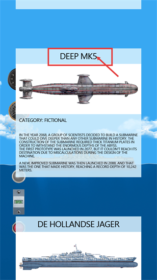 1、了解【DEEP-MK5】潜艇信息,它是虚构类深潜潜艇,2088年改进型曾创下10,242米潜深纪录。