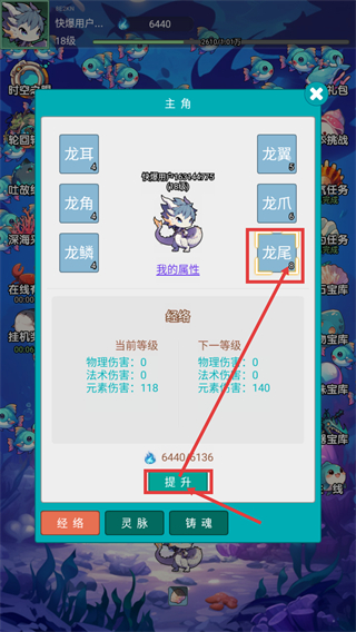 3、进入【主角】界面,点击【提升】按钮升级【经络】,可强化【龙尾】等部位属性,提升元素伤害等战斗能力。