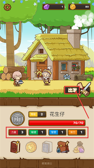 1、查看角色【花生仔】的【力量-3】【敏捷-1】等属性,点击【出发】按钮进入战斗,利用属性优势推进关卡。