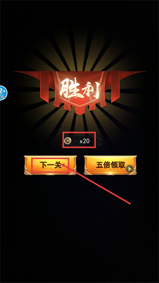4、通关后可获得【铜钱-x20】奖励,点击【下一关】继续挑战,也可选择【五倍领取】获取更多资源。
