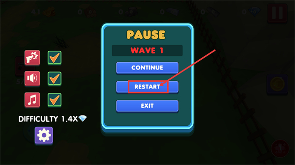 4、在【PAUSE】界面中选择【RESTART】可重新开始当前【WAVE-1】关卡,便于调整策略重试。