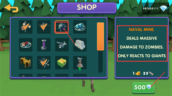 2、在【SHOP】中花费【500】钻石解锁【NAVAL-MINE】,该道具仅对巨型僵尸生效,能造成高额伤害。
