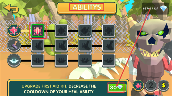 1、在【ABILITIES】界面中,消耗【30】钻石升级【FIRST-AID-KIT】,可缩短治疗技能的冷却时间。