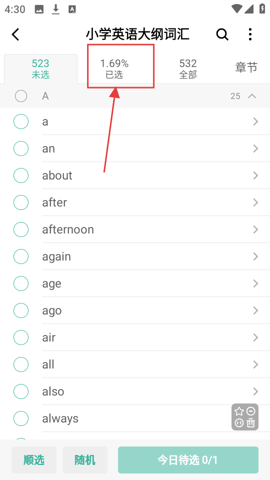 1、进入墨墨背单词的词书页面,查看【已选】的单词占比情况,心里有数后准备操作啦。
