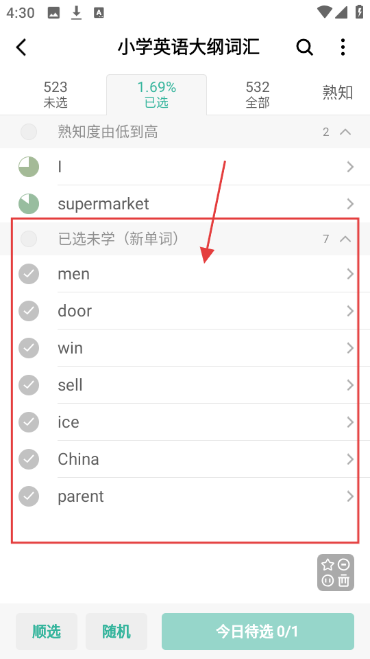 2、点击【已选】单词区域,查看所有已选的单词列表,找到想要移除的单词哦。