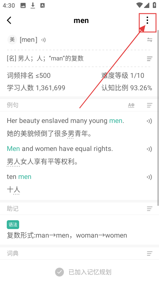 3、进入某个已选单词的详情页,点击右上角的三点图标,会弹出相关操作选项菜单呢。