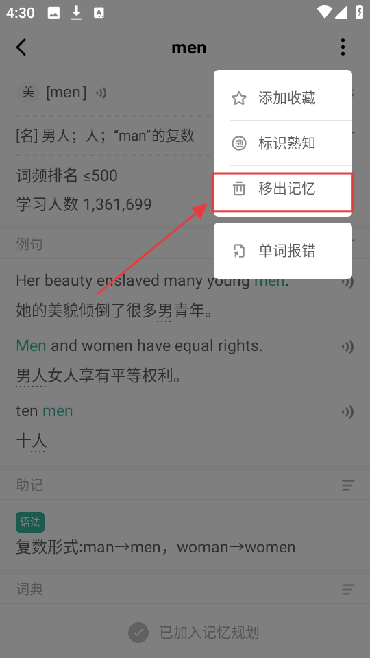 4、在弹出的操作选项菜单中,点击【移出记忆】,将该单词从记忆规划中移除,重复操作可清空所有已选词哦。
