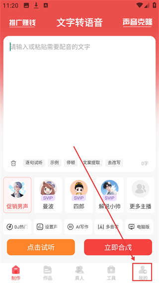 1、在文字转语音的制作页面,点击底部的【我的】选项,可进入个人中心界面,管理账号相关功能啦。