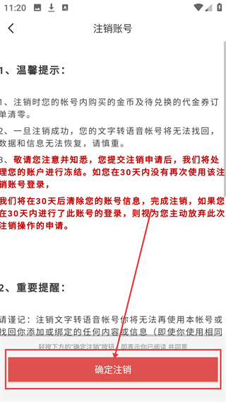 4、进入注销账号页面,确认相关提示后,点击【确定注销】按钮,即可提交账号注销的申请啦。