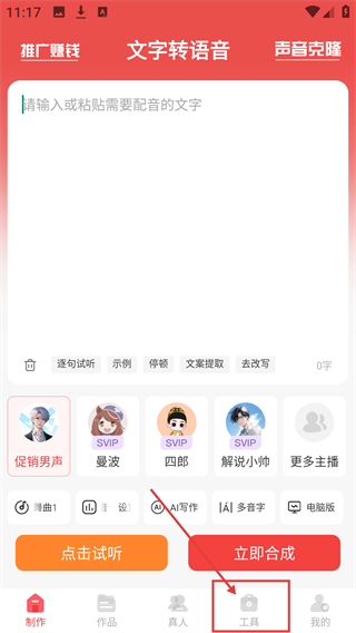 1、在文字转语音页面,点击底部的【工具】选项,就能进入各类功能工具的选择页面啦。
