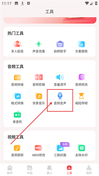 2、进入工具页后,在音频工具区域选择【音频变声】选项,就能进入变声功能的编辑界面哦。