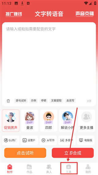 1、在文字转语音的制作页面,点击底部的【工具】选项,可进入功能工具界面,使用各类音频处理工具啦。
