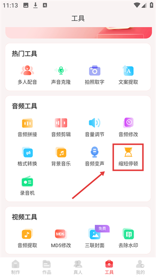 2、进入工具页面后,在音频工具分类下,点击【缩短停顿】选项,进入对应的音频处理功能界面哦。