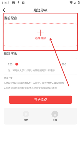 3、进入缩短停顿页面后,点击【选择音频】区域,可挑选需要处理的配音音频,准备进行停顿优化啦。