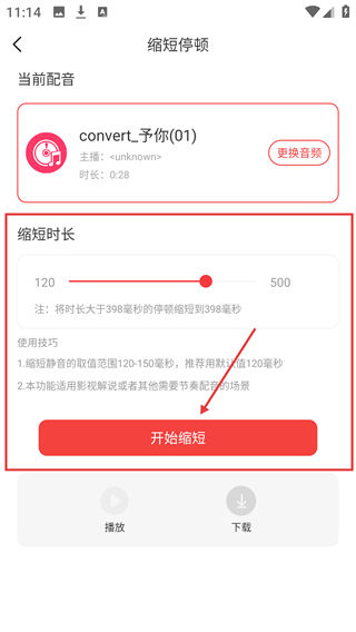 4、选定音频并调整缩短时长参数后,点击【开始缩短】按钮,即可对音频的停顿部分进行优化处理啦。