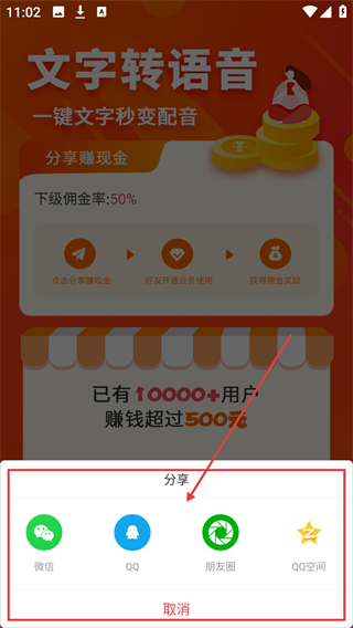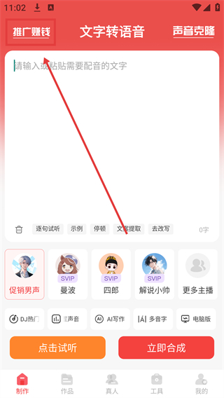 1、在文字转语音的制作页面,点击左上角的【推广赚钱】选项,可进入邀请好友的推广界面,参与赚佣金活动啦。