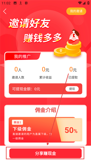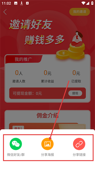 2、进入推广页面后,能查看邀请人数、累计收益等数据,点击【分享赚现金】按钮,可打开分享渠道选择栏哦。
