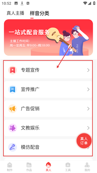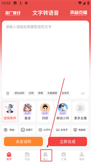 1、在文字转语音的制作页面,点击底部的【真人】选项,可切换到真人配音的服务界面,解锁专业主播配音啦。