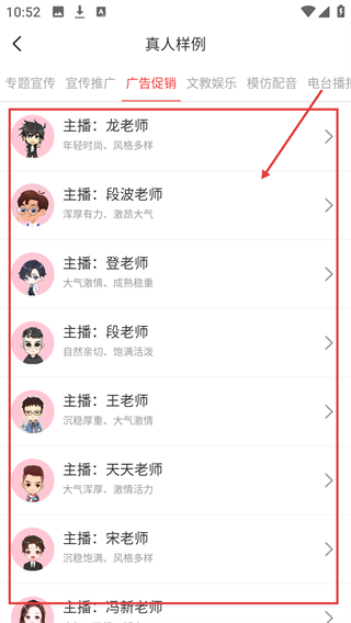 3、在真人样例页面,选择目标主播(如【龙老师】),点击其条目可进入主播详情页,了解配音风格与作品啦。